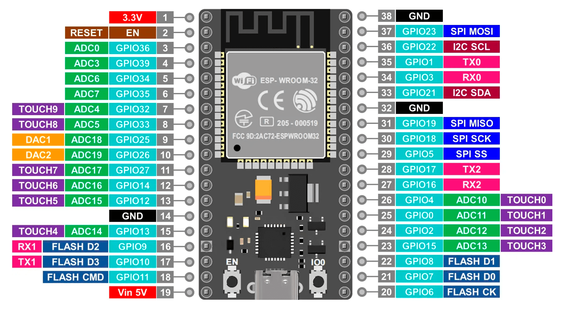 • 38 пинов — больше GPIO, ADC, сенсорных входов