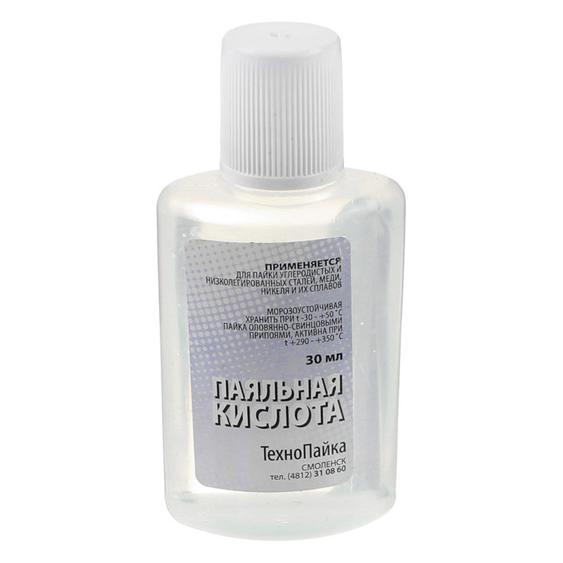 Паяльная кислота (30 мл) применяется для удаления с поверхности пленки окислов, которая присутствует практически на всех металлах. Паяльную кислоту применяют для следующих металлов: медь и ее сплавы, никель, низколегированная сталь. Активная, обязательно требуется промывка.