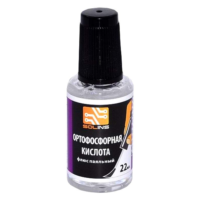 Кислота ортофосфорная с кисточкой (22 мл), Solins применяется для удаления ржавчины и пайки нержавеющей стали. После пайки остатки легко удаляются водой. Нежелательно использовать ортофосфорную кислоту при пайке высокочастотных элементов и печатных плат из-за кислотности остатков.