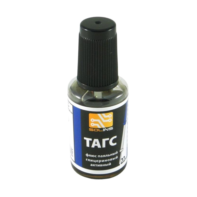 Флюс активный ТАГС, Solins применяется для пайки элементов радиомонтажа. Низкотемпературный флюс ТАГС используется при пайке поверхностей или деталей припоями оловянно-свинцовой группы в температурном диапазоне +150…+320 °C. При пайке печатных плат имеет остаточное сопротивление, поэтому после пайки требует промывки водой или спиртом. Не рекомендуется использовать для SMD монтажа.