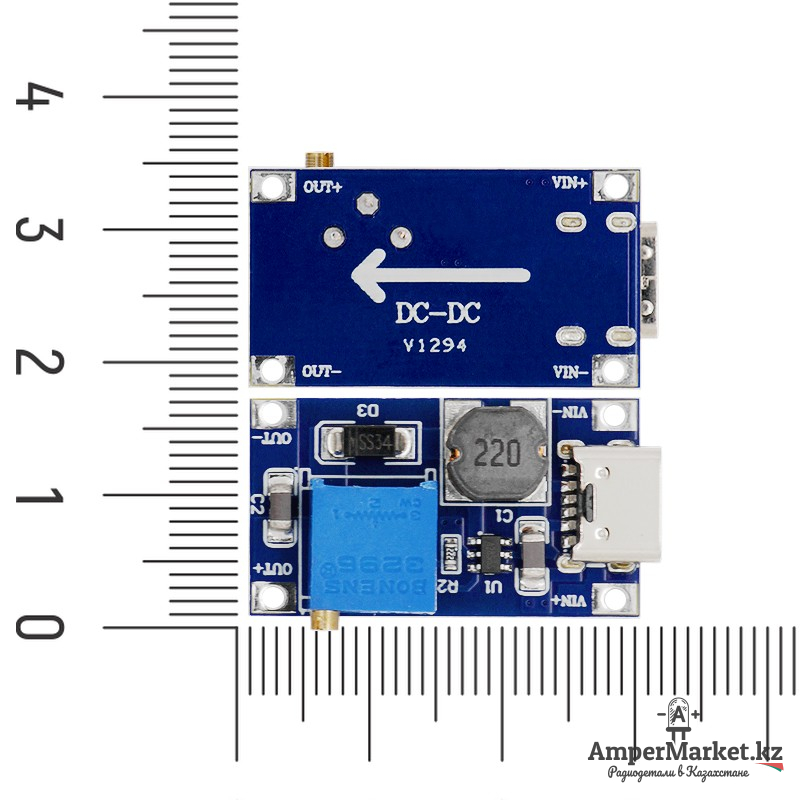 Повышающий DC-DC преобразователь на основе микросхемы MT3608. Выходное напряжение модуля регулируется подстроечным резистором.